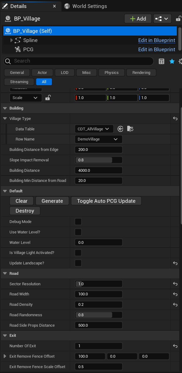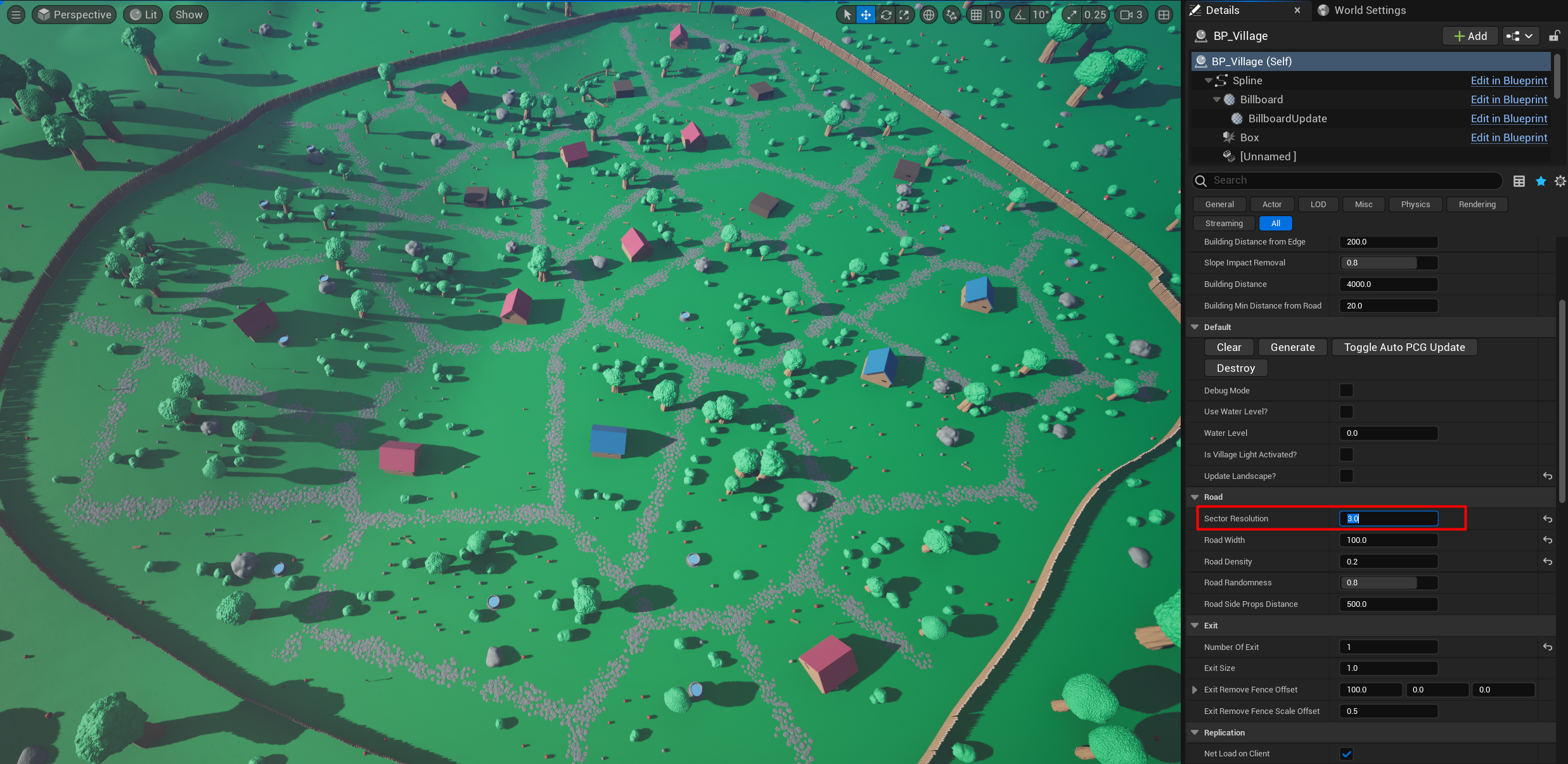 Number Of Exits: Add exits in the village fence. <mark style="color:red;">Note that a current bug creates artifacts in the bound calculation to remove the fences, this is a PCG bug that will be solved in 5.4.2</mark>