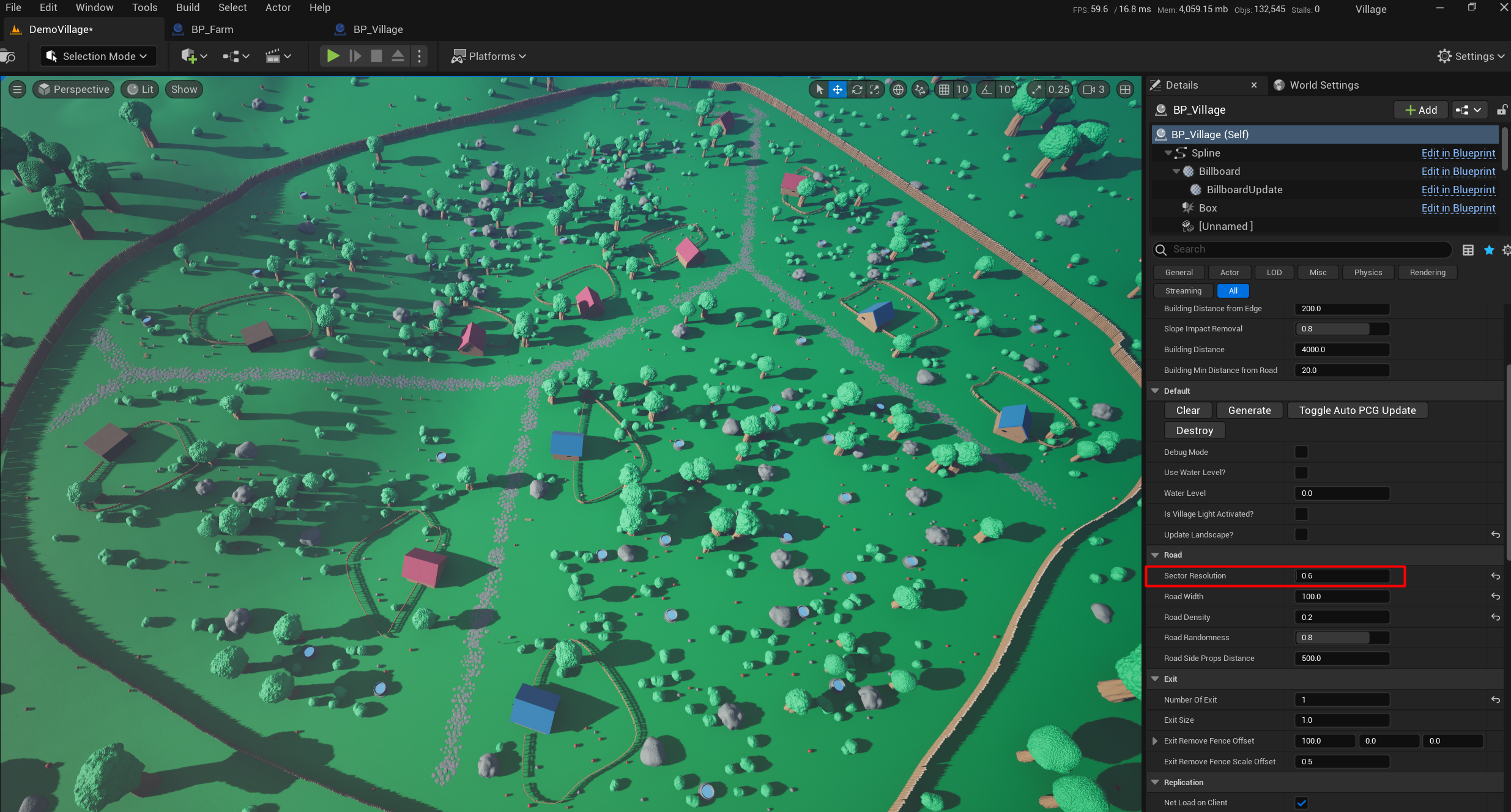 The rest of the settings are on the BP\_Village and BP\_Farm exposed to be customized in your scene. I placed them here because it makes it a lot easier to tweak the final result of your village, and it probably fits better per village and not globally.